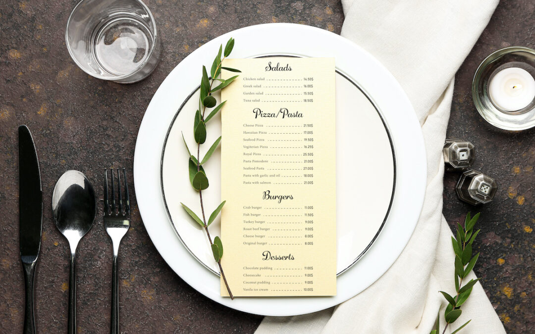 Beautiful table setting with menu on grey background